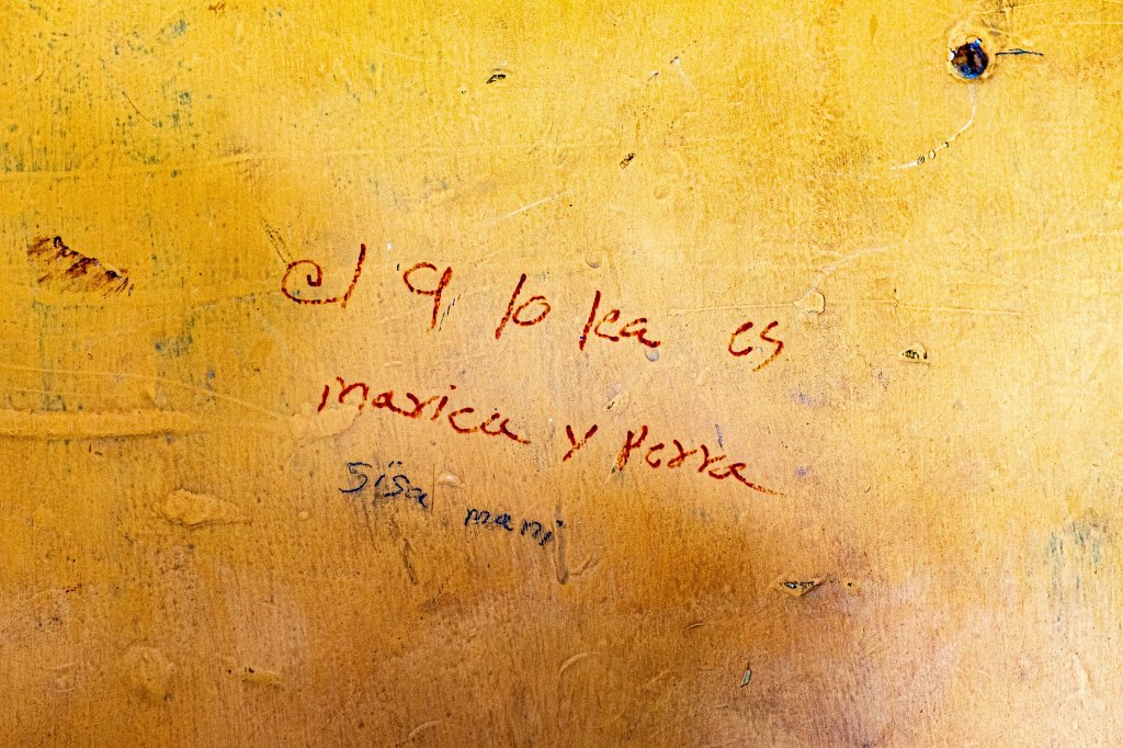 En el legendario Colegio Pinillos, declarada como la primer universidad del país y que hoy es colegio público, encontré muchas paredes rayadas. Me llamó la atención este mensaje, donde señala una forma de minorización que tiene que ver con el acto del mirar, con la orientación sexual, con la feminidad y con la forma despectiva de tratar a una mujer que tiene libertad de su propio cuerpo cuerpo. Es una de las escuelas para la masculinidad tóxica y frágil, con pocos espacios de socialización formal.